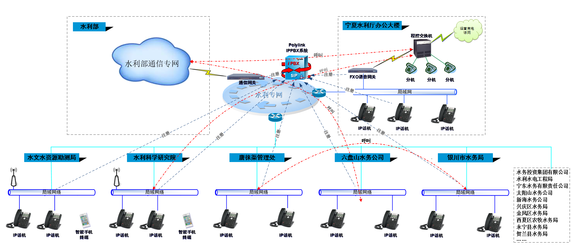 围绕宁夏水利信息化发展目标和任务,遵循统一的标准规范,利用宁夏水利完善的基础网络开展的语音通信,将通信覆盖范围延伸至管理段,与原有的PSTN通信网络形成互补的通信模式,实现方便各项水利工作及防洪通信保障的功能。